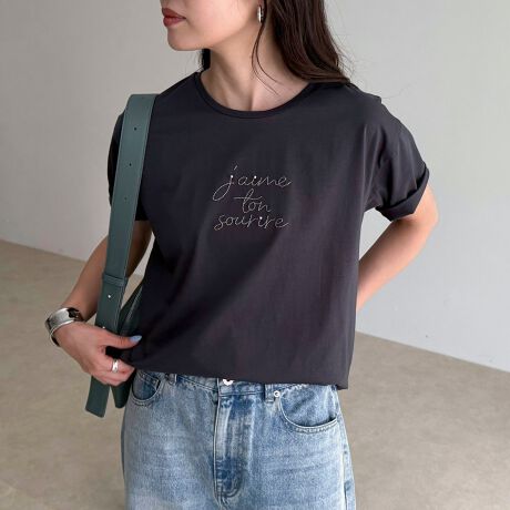 ・フロントの刺繍にパールが施された上品な雰囲気の半袖Tです
