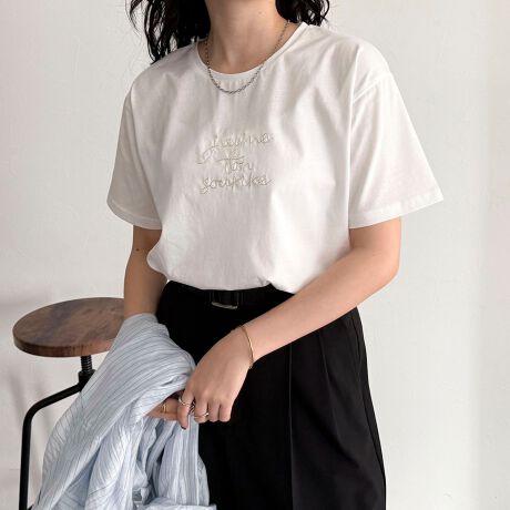 ・フロントの刺繍にパールが施された上品な雰囲気の半袖Tです