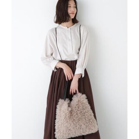 手や肩に持ち手を掛けると天口中央部分がへこみニュアンスあるシルエットの出るスクエアフェイクファーバッグです。