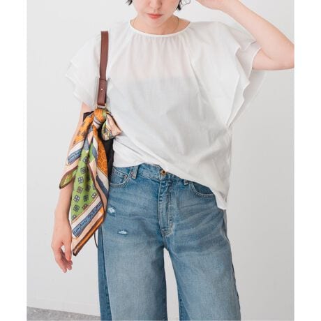 二重に重ねたフリルスリーブがさりげなく華やかさを添え、シンプルになりがちな夏の装いに程よいアクセントを加えてくれます。