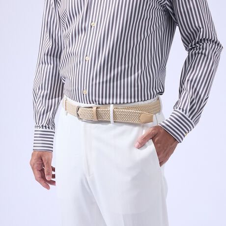 品のあるカラーで編み込まれたゴムメッシュベルトで 美錠にはシルバーカラー、剣先と遊革には合成皮革を使用し、高級感あるデザインに仕上げています。 ホールレスタイプなのでサイズ感を細かく自由に調節することが可能で 自分のウエストサイズにアジャストできます。 通気性が良いのもメッシュベルトの魅力です。