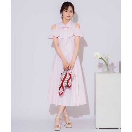 気分で着こなしチェンジ、2WAYデザインワンピース【Design】・フリルのボリュームとウエストタックの絶妙なバランスが、可愛さを引き立てるワンピース。・フロントのボタンを留めてオフショル風にも着られる、アレンジのきくデザインです。・細めのリボンが上品な印象をプラスし、大人の甘さを演出。・リボンは取り外し可能で、気分に合わせた着こなしが楽しめます♪・内側のボタンで袖を半袖にもできる、さりげない機能性も魅力◎・バックはレースアップ仕様で、ウエストまわりのフィット感も調整できます。【Fabric】・ピンクストライプ・ブルーストライプは、さらりとしたポリエステルと柔らかなコットンを掛け合わせた、ナチュラルな風合いが魅力。・ネイビーは、ほんのり落ち感のあるレーヨン混素材で、上品な印象に。・ピンクストライプ、ブルーストライプ、ネイビーの3色展開となります。【Care】ドライクリーニング