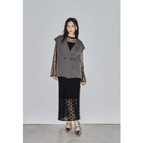 フレンチスリーブのノーカラーベストは羽織るだけでマニッシュな印象に。