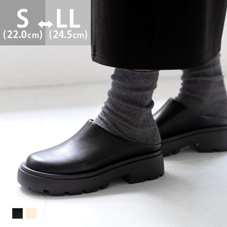 Mは履き口が少しきつめ。かかとが少しはみ出る。Lはゆとりがあるが楽に履ける。靴下合わせもできるサイズ感。