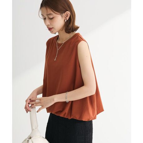 肌触りのさらりとした素材感で仕立てたノースリーブプルオーバー。裾にゴムを施したふんわりバルーンシルエットがフェミニンな雰囲気を演出します。ゆとりあるサイズ感の快適な着用感も魅力的。どんなボトムとも着合わせしやすく、合わせ方次第でロングシーズン活躍するおすすめのアイテムです。透け感[ややあり]
