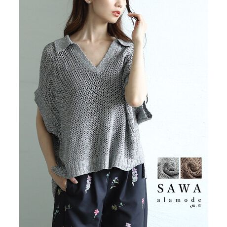 【トップス】 サマーニット スキッパー ドルマン メッシュ スリット ラメ 重ね着 グレー ブラウン
