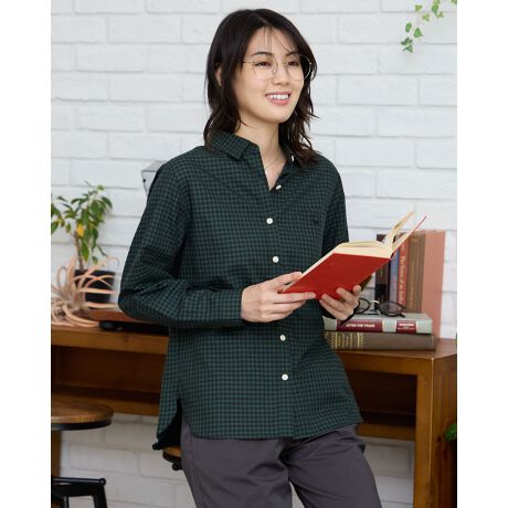 落ち着いたカラーのチェック柄素材を使用しています。ポケットのデザインが特徴的です。オールシーズンに対応でき、インでもアウトでも着こなし自在なシャツになっています。