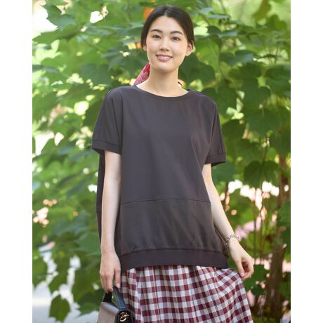 [型番:467R8401]キレイめなポンチを使用した丈長めのトップスです。裾周りにチュールを切り替えてポイントをつけました。ゆったりシルエットと二の腕が隠れる袖丈で、1枚でスタイリングが決まるトップスです。