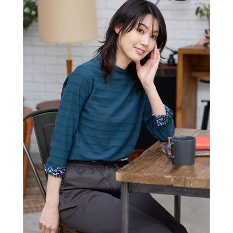 編み柄でボーダーを表現したトップスです。襟が高めなので羽織やカーディガンのインナーとしても使いやすいデザインです。折り返した際に見える袖口裏の花柄がポイントです。