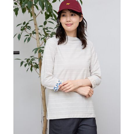 編み柄でボーダーを表現したトップスです。襟が高めなので羽織やカーディガンのインナーとしても使いやすいデザインです。折り返した際に見える袖口裏の花柄がポイントです。