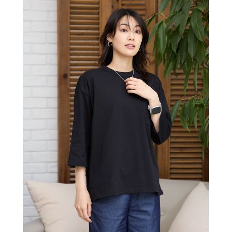 ベーシックなビッグシルエットTシャツの7分袖バージョンです。表面がなめらかで上品なプレーティング天竺素材を使用しています。吸水速乾と接触冷感の機能付きで、汗ばむ季節もさらっと快適な着心地です。使いやすいベーシックカラーと差し色を入れた4色展開です。
