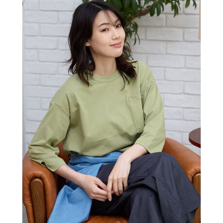 ベーシックなビッグシルエットTシャツの7分袖バージョンです。表面がなめらかで上品なプレーティング天竺素材を使用しています。吸水速乾と接触冷感の機能付きで、汗ばむ季節もさらっと快適な着心地です。使いやすいベーシックカラーと差し色を入れた4色展開です。