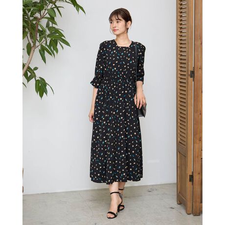 ラフなタッチの花や葉っぱのモチーフがアイキャッチになるワンピース。小さな波状の凹凸が並ぶポリエステルサッカーの生地をセレクト。肌との接触面が少なく清涼感に富みシワになりにくい点も魅力。チャーミングなポップさは残したまま、幼さを軽減するため配色にニュアンスカラーを用いています。湖のような深いブルーグリーンもムードがあり小物のカラーを選びません。袖山に加えたギャザーやフロントに並ぶ包み釦などディティールも華やかなアイテムなので、スキンジュエリーを添えた引き算の小物使いが品良く見え大人世代にはおすすめです。普段使いに便利なポケット付き。