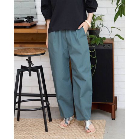 麻の節目が涼しげでナチュラルな中にも上品さを感じられる生地をセレクト。適度な張りと厚みはボディの肉感を拾わず控えめなツヤとしっとりした質感で、チクチクせず夏におすすめのパンツです。ウエストは着脱に便利なゴム使用。ギャザーは少なめにし腰周りの膨らみを軽減。一緒に通したヒモで固定すればズリ下がりの心配もありません。裾にかけて丸みを付けたバレル(樽)型のシルエットは足首辺りで丸く膨らむ様子に、こなれた雰囲気があり時流の着こなしが楽しめるアイテム。シンプルなトップスや短丈を合わせた辛口コーデの他に、ゆったりトップスを着流したラフなスタイルも大人世代にはおすすめです。