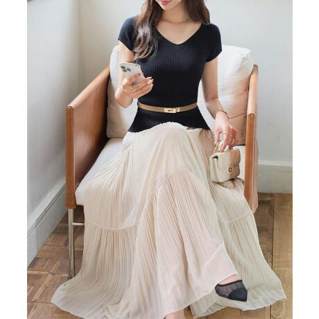 スカートは歩くたびに揺れるやわらかなシフォン素材で、女性らしさをさりげなくプラス。