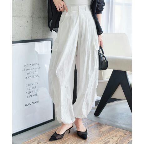 裾はドロスト仕様でワイドパンツにもジョガーパンツ風にも絞り具合で着こなしを変えられるミリタリーパンツです。