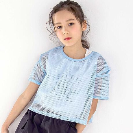 着心地のいい天竺TシャツにメッシュTシャツの重ね着ができる女の子用半袖Tシャツ。