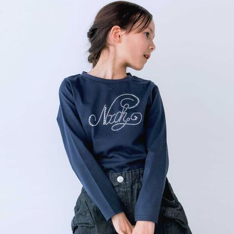 大きいロゴラインストーンが目を引く女の子用長袖Tシャツ。