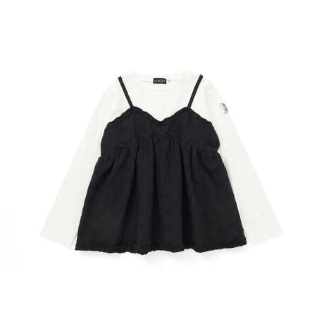 Tシャツにビスチェを重ね着したような女の子用長袖Tシャツ。