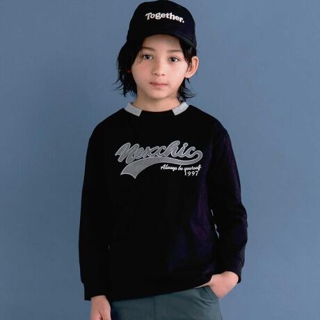 大きいロゴと数字のバッチや襟がポイントになった男の子用長袖Tシャツ。