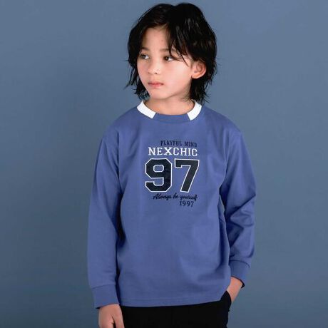 大きいロゴと数字のバッチや襟がポイントになった男の子用長袖Tシャツ。