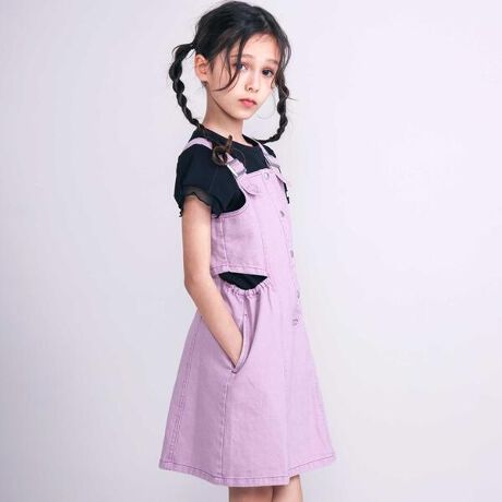 後ろの大きいダメージ刺しゅうがポイントになった女の子用ジャンパースカート。
