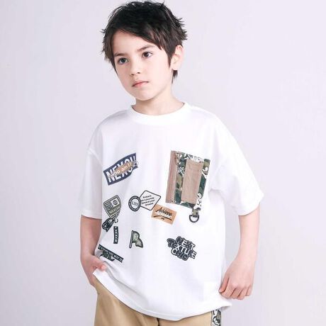 ワッペンのようなプリントがいっぱいの男の子用半袖Tシャツ。