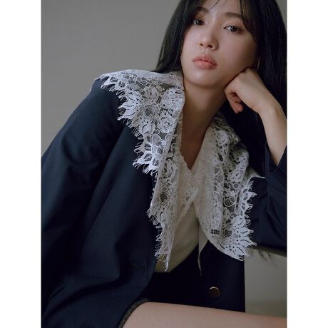 異なる柄のレースの襟を贅沢に2枚重ねて、トレンド感を出したデザイン。
