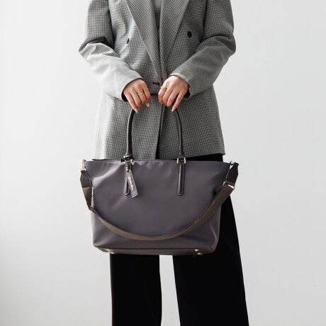 美しいツヤのあるナイロン素材を使用した台形トートバッグ。