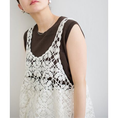 スタイリングの主役になる、クロシェ風のレース編みが印象的なタンクトップ。