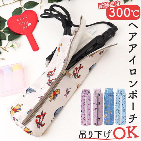 【ヘアアイロンの持ち運びに便利】旅行や出張で大活躍◎キャラクターデザインが可愛い「ヘアアイロンポーチ」。【熱いまま収納できる!耐熱仕様】内側の耐熱温度は300度。使用後にあたたかさが多少残っていてもそのままIN。(※)耐熱仕様ですが、安全のため冷ましてから収納してください。【ガバッと開いて出し入れスムーズ】下部まで大きく開くファスナー式。アイロンの出し入れも手間取らない◎【コードを収納できるポケット付き】外側サイドには、まとめたコードを入れておける!絡まずスッキリ。【吊り下げできる2種類のストラップ】スリムなストラップと、スナップボタン式のワイドストラップ。お好みで使い分け可能。【見た目も可愛らしいラインナップ】みんなが大好きな、キャラクターのプリントデザイン。ギフトにもおすすめのアイテム☆