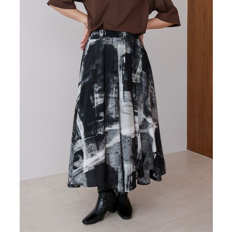 スカートのように見えるキレイめなワイドパンツ。ふんわり広がるシルエットは、楽さもありつつ、フェミニンな雰囲気。ゆったりしていて体のシルエットを拾わないので体型カバーにも◎です。大きめの柄はモノトーンなので派手になりすぎず、大人っぽく着られます。