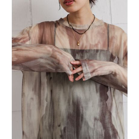 カラーごとに異なるニュアンス柄が、甘さを抑えた上品な表情をつくります。ほどよい透け感で抜けを出しつつ、首元はすっきり。体に張り付きにくいゆったりシルエットだから、ラインを拾いにくいのも魅力です。インナー使いはもちろん、キャミを重ねてトップスとしても活躍。ワンピやジャケット、ニットの中に合わせてもバランスよく決まります。