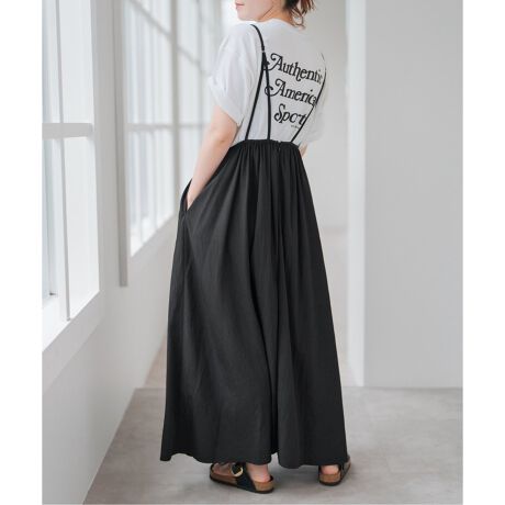 肩紐付きのデザインがアクセントとなりシーズンレスで着用いただけるギャザースカートです。