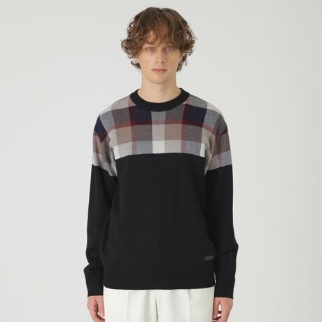 【クレストブリッジチェック柄を大胆に切り替えたクルーネックニット】