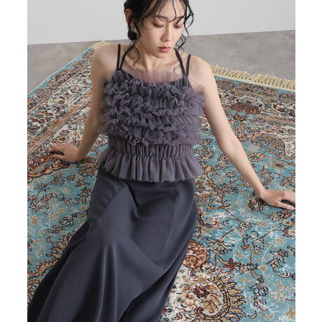 チュールをたっぷりと使用し、透け感にこだわったトップスが華やかでエレガントな印象に。