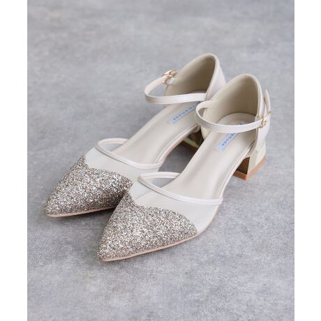 グリッターとハードチュールの透け感が可愛いチャンキーヒールパンプス。