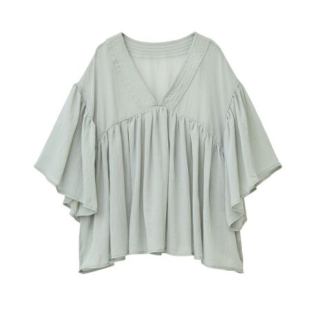 シワ加工を施したシアー生地で軽やかに着用いただけるデザインブラウス。深めのVネックにたっぷりギャザーのエアリーなフリルがフェミニンな雰囲気をプラスします。ゆったりとした着心地ながら、ボトムバランスの取りやすい絶妙な丈感で着回し力も抜群。きれいめなアイテムだけでなく、デニムに合わせたナチュラルなスタイリングもおすすめです。透け感[ややあり]