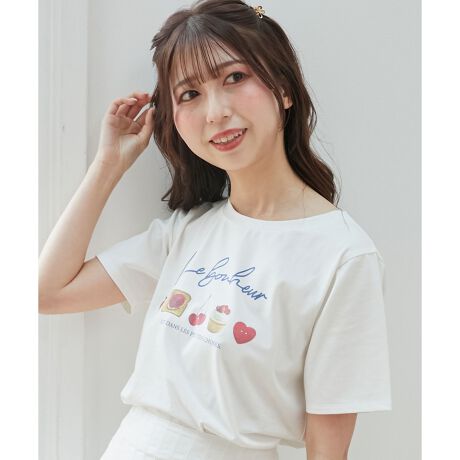 いちごやチェリー、ケーキ等心ときめくスイートなモチーフを散りばめたガーリームードたっぷりなTシャツ。