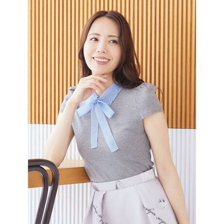 シアーなオーガンジーを使用した衿とリボンが、優雅さと華やかさを演出するキャップスリーブのニットプルオーバー。