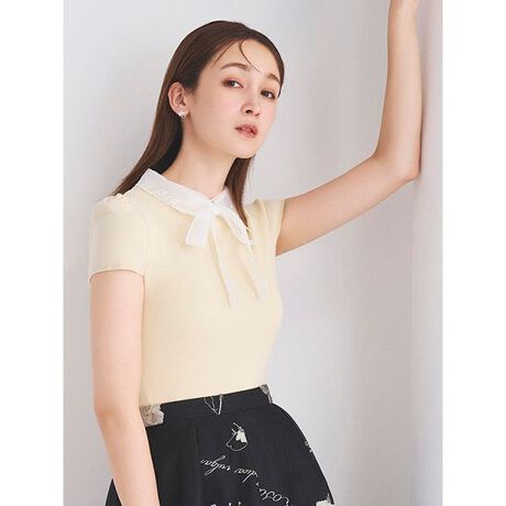 シアーなオーガンジーを使用した衿とリボンが、優雅さと華やかさを演出するキャップスリーブのニットプルオーバー。