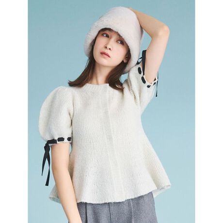 袖に通したグログランリボンがキャッチーなペプラムカーディガン。