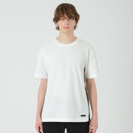 素材にはポリエステルのタック柄生地を採用。特殊な編み柄で凹凸感ある見映えが特徴です。表面感ある見た目でTシャツながら存在感ある一着に仕上げています。