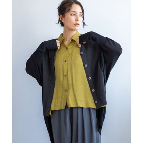 ワイドシルエットのカーディガンは、表情豊かで変則的な襟元がポイント。