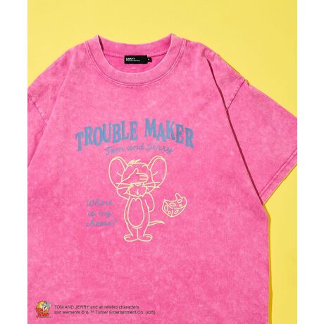 ネズミのジェリーが見せる、ちょっぴり小悪魔な笑顔と「TROUBLE MAKER」のロゴが印象的な一枚。