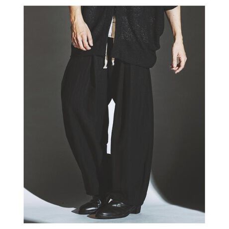 深めのタックとサイドの立体構造が独自の輪郭を生み出します。ウエストはリブ仕様+長めのドローコードで、ストレスフリーな穿き心地と視覚的アクセントを両立。