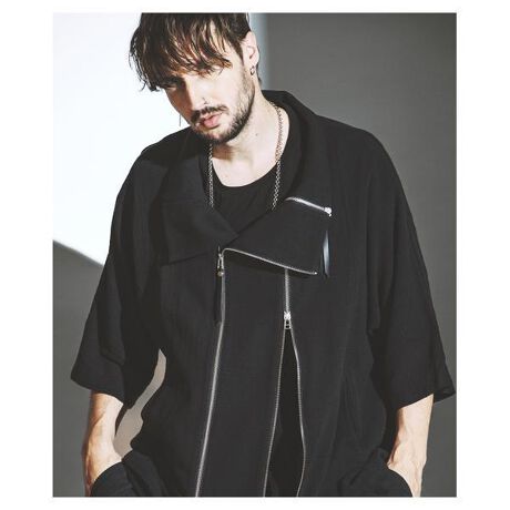 左右対称に走るダブルジップデザインが目を引く、変形シルエットのオフタートルライダースジャケット。