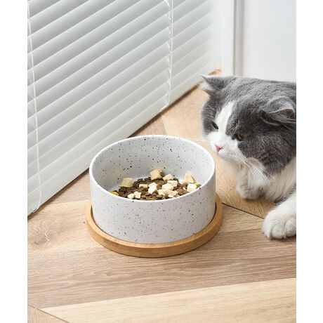 シンプルで上品なデザインのペット用陶器ボウルセットです。竹製のベースが付属しており、滑りにくく安定感があります。