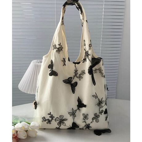 ■デザイン *蝶、草花などの図案を刺繍した、立体感のある模様が目を惹きます。口がガバッと開くのでとても使いやすく、仕切りなしで荷物がたっぷり収納できます。本や書類などを収納しやすいサイズ。サブバッグとしても使いやすいです。