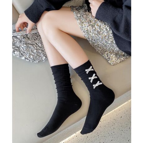 立体的なサテンリボンが印象的なソックス。足首部分に重ねたクロスリボンがガーリースタイルを引き立たせてくれます。シンプルなスニーカーやローファーと合わせて、Y2Kや韓国ファッション好きな方にもぴったりのアクセントアイテム。程よく伸びるフィット感でストレスフリー。